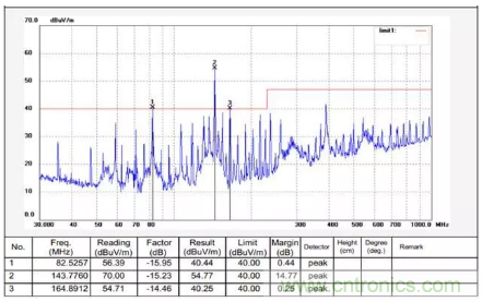 某行車記錄儀,測(cè)試的時(shí)候要加一個(gè)外接適配器,在機(jī)器上電運(yùn)行測(cè)試時(shí)發(fā)現(xiàn)超標(biāo),具體頻點(diǎn)是84MHZ、144MH、168MHZ,需要分析其輻射超標(biāo)產(chǎn)生的原因,并給出相應(yīng)的對(duì)策。輻射測(cè)試數(shù)據(jù)如下: