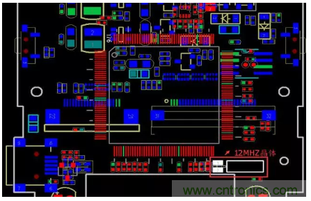 該產(chǎn)品只有一塊PCB,其上有一個(gè)12MHZ的晶體。其中超標(biāo)頻點(diǎn)恰好都是12MHZ的倍頻,而分析該機(jī)器容易EMI輻射超標(biāo)的屏和攝像頭,發(fā)現(xiàn)LCD-CLK是33MHZ,而攝像頭MCLK是24MHZ;通過(guò)排除發(fā)現(xiàn)去掉攝像頭后,超標(biāo)點(diǎn)依然存在,而通過(guò)屏蔽12MZH晶體,超標(biāo)點(diǎn)有降低,由此判斷144MHZ超標(biāo)點(diǎn)與晶體有關(guān),PCB布局如下: