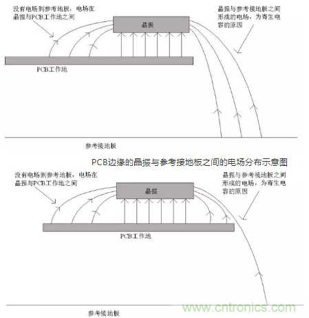 從圖中可以看出,當(dāng)晶振布置在PCB中間,或離PUB邊緣較遠(yuǎn)時(shí),由于PCB中工作地(GND)平面的存在,使大部分的電場(chǎng)控制在晶振與工作地之間,即在PCB內(nèi)部,分布到參考接地板去的電場(chǎng)大大減小,導(dǎo)致輻射發(fā)射就降低了。