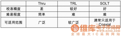 在三種常用的測(cè)試儀器中,網(wǎng)絡(luò)分析儀的校準(zhǔn)方法最為嚴(yán)謹(jǐn),頻譜分析儀次之,示波器的校準(zhǔn)方法最為簡(jiǎn)單。因此,我們這里主要討論網(wǎng)絡(luò)分析儀的校準(zhǔn)方法。網(wǎng)絡(luò)分析儀常用的校準(zhǔn)方法有三種,thru、trl和solt。三種方法的特性如表1所示。