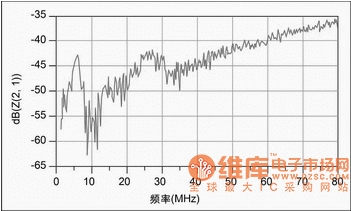 測(cè)試電源系統(tǒng)性能時(shí),通常使用網(wǎng)絡(luò)分析儀,測(cè)試對(duì)象是電源系統(tǒng)的self-impedance和transfer-impedance。一般情況下,電源系統(tǒng)的阻抗均遠(yuǎn)小于網(wǎng)絡(luò)分析儀系統(tǒng)阻抗(50歐姆),所以測(cè)試時(shí)只要做直通校準(zhǔn)就可以了,利用公式s21=z/25就可以得到電源系統(tǒng)的阻抗。圖2所示為某單板電源阻抗特性。