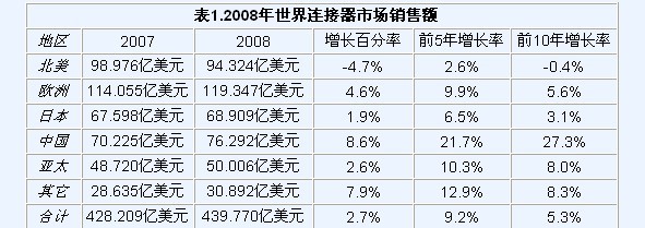 專業(yè)的連接器市場研究公司-Bishop&Associates于2009年4月公布了2008年世界連接器工業(yè)市場數(shù)據(jù),數(shù)據(jù)顯示受世界經(jīng)濟(jì)危機(jī)的拖累,2008年世界連接器工業(yè)銷售增幅急劇下滑,與上一年相比,僅增長2.7%,而2007年的增幅為7.2%,盡管如此,連接器工業(yè)仍然實(shí)現(xiàn)了6年的連續(xù)增長(2003 年11.2%, 2004年17.9%,2005年6.2%,2006年12.6%,2007年7.2%,2008年2.7%),與經(jīng)濟(jì)危機(jī)下其它電子元器件普遍負(fù)增長的糟糕表現(xiàn)相比,這一增長數(shù)字,是令人欣慰的。