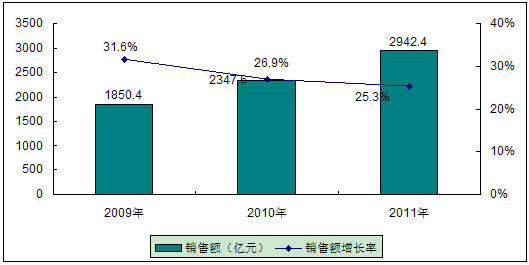圖3 2009-2011年中國汽車電子市場規(guī)模與增長預測