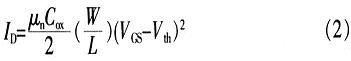 設(shè)置柵極寬度為W,有效柵極長(zhǎng)度為L(zhǎng),柵極下氧化層的厚度為tOX。MOS管的特性方程為: