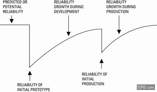 如圖4所示,每個產(chǎn)品壽命周期都包含不同階段的轉(zhuǎn)變,由原型到開發(fā),再由開發(fā)到生產(chǎn),過程中的可靠性會不斷增長。換句話說,每項(xiàng)設(shè)計在其壽命周期中,可靠性都會增加,而成本則會下降。這反映了可靠性的增長不單是設(shè)計工程師的責(zé)任而已。