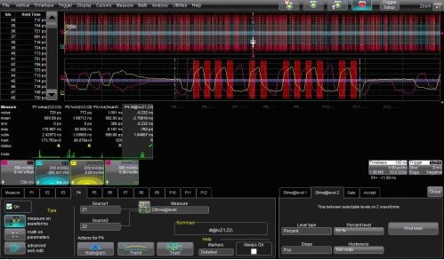 WaveScan把測量過濾中所有符合測量標準的波形累積起來形成掃描疊加的軌跡圖(圖2中間的軌跡)。這幅余輝圖包含了全部捕獲的歷史波形軌跡。我們現(xiàn)在就可以對被選擇出來的整個波形組在掃描疊加軌跡圖上應用測量參數(shù)進行測量。你也可以在被選擇波形的縮放軌跡上應用測量參數(shù)進行測量。