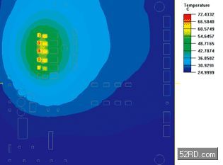 圖1b:原始設(shè)計(jì)中,在均勻熱流時(shí)PCB上表面的溫度分布情況。