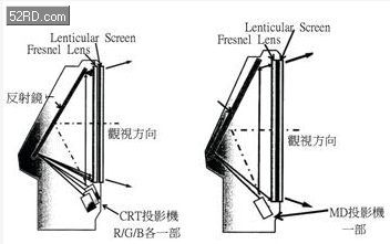 (圖三) (a)CRT背投電視的結構;(b)MD背投電視的結構