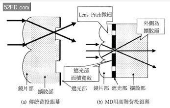 事實上早期的MD方式RP-TV都是使用CRT背投電視螢幕,因此始終無法充分發(fā)揮MD方式RP-TV的特性,有監(jiān)于此日本凸版印刷公司首度開發(fā)如(圖五)所示MD方式RP-TV專用螢幕,由圖可知MD方式RP-TV專用螢幕的LenticularLens與遮光部各自獨立設置,尤其是遮光部設于擴散部后面革命性設計,使得該MD方式RP-TV專用螢幕可以具備極佳的光學特性。