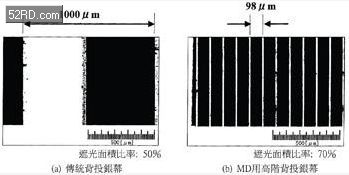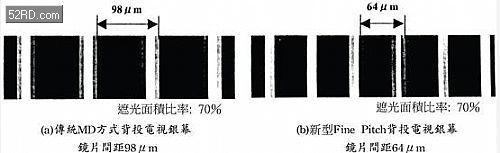 如上所述RP-TV用螢幕通常是在明亮室內(nèi)環(huán)境中使用,對RP-TV螢幕而言阻斷室內(nèi)外亂光提高影像對比(Contrast)非常重要。影像光線穿透時不會被遮光部遮蔽的前提下,通常開口部的面積越小,亦即遮光部的面積比率越大,遮蔽外亂光的能力越強,影像對比也越高。