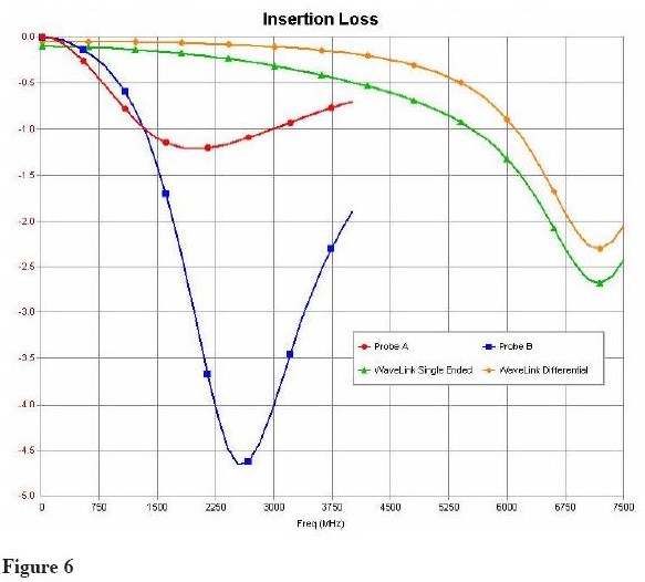 為了比較差分探頭的性能,通常在良好定義和常數(shù)電路中畫出負載效應(yīng)。比如,每個探頭在50歐姆理想環(huán)境中產(chǎn)生的插損如Figure 6所示。插損用dB表示;作為電壓表示,必須除以20,采用反對數(shù)。比如Probe B導(dǎo)致的4.6dB的插損會產(chǎn)生41%的幅度損失。這對于被探測的信號有顯著影響。