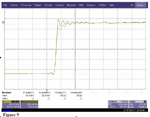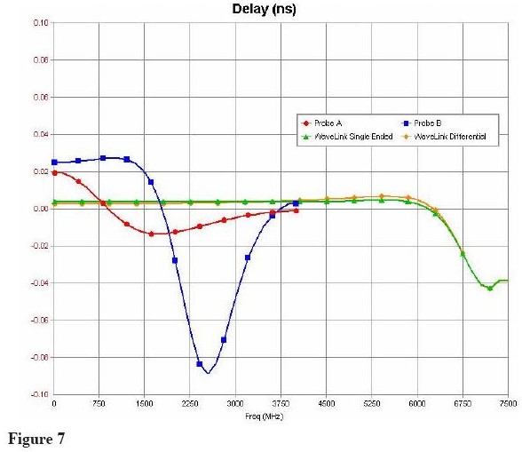新的WaveLinks探頭不通過同一個測試信號,測量結(jié)果如Figure 10 所示。由于探頭負載(<1%)信號幅度有輕微的減少,但主要的信號邊沿完全沒有失真。探頭阻抗產(chǎn)生的延遲是2ps,不會隨著信號頻率改變。