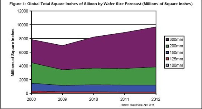 圖1所示為iSuppli公司對2008-2013年硅片面積總產(chǎn)量的預(yù)測,按晶圓尺寸細分。