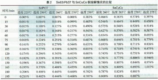 一些其它值得注意的現(xiàn)象包括:對(duì)于初始銅含量大約為O.3%的未經(jīng)使用的SnCuCo,與銅含量為0的新啟用的SnPb37相比較,在經(jīng)歷各種溫度狀態(tài)下的研究后發(fā)現(xiàn),銅溶解的速度顯得相當(dāng)?shù)穆?br /> [page]