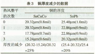 在通過第一次的時(shí)候,無鉛化合金比起SnPb37焊料除去的銅要少。同樣,當(dāng)通過第二次的時(shí)候,僅有12.5%和10%被移除,在經(jīng)歷第三次的時(shí)候僅有25%和20%的銅被移除(表3)。
