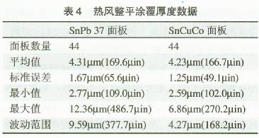 正如前文所談及的那樣,在實(shí)施PCB組件制造的時(shí)候,所采用熱風(fēng)整平工藝的比例從高達(dá)所有電路板中的80%減少到大約60%。隨著要求具有平坦一致的表面(共平面)的SMT技術(shù)穩(wěn)步發(fā)展,這種減少現(xiàn)象還會(huì)同步的發(fā)生。傳統(tǒng)的SnPb熱風(fēng)整平工藝能夠提供具有令人滿意共面性的SMT電路板。現(xiàn)在關(guān)注的是無鉛化中熱風(fēng)整平會(huì)產(chǎn)生什么問題,經(jīng)無鉛化熱風(fēng)整平的電路板會(huì)更好還是更壞,或者與經(jīng)SnPb熱風(fēng)整平工藝處理的PCB組件是否具有相同的共平面效果?美國(guó)MetallicRe—sourcesInc公司的技術(shù)人員為此開始了一次又一次的試驗(yàn),結(jié)果表明SnCuCo比起傳統(tǒng)的SnPb共熔合金,會(huì)產(chǎn)生略簿一些、更趨共平面效果的涂覆。這些結(jié)果被反復(fù)地的進(jìn)行研究。表4顯示了從一臺(tái)水平放置的熱風(fēng)整平設(shè)備上實(shí)施這些試驗(yàn)的一些測(cè)試結(jié)果。