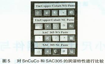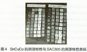 圖4顯示了SnCuCo合會(huì)的潤(rùn)濕特性。它與存采用了各種涂覆方式的電路板上的SAC305具有非常相似的效果。這也就說明SnCuCo至少與SAC305一樣,在電路板潤(rùn)濕方面具有相同的性能。
