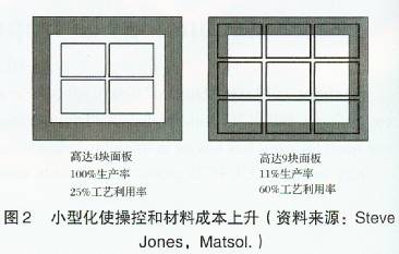 如果在一個方向持續(xù)地發(fā)生不正確的變化,在生產(chǎn)期間通過調(diào)整處理,可以很容易地得到糾正。但是在PCB生產(chǎn)過程中大多數(shù)的隨機變化是很難予以控制的。在實際生產(chǎn)過程中,每塊面板的尺寸可能會發(fā)生變化。當設計規(guī)定的允許誤差為100μm或者更大的時候,這可能不會是什么問題。然而,當把大量的功能放入一個很小的空間時這就意味著設計規(guī)定的允許誤差趨小。當裝配人員將PCB組件放置入較小形狀的面板上時,隨機變化現(xiàn)象將會大大的減少。但令人感到遺憾的是,這將涉及到大量的成本問題:為了滿足小型化面板的需要,需要更多的處置成本,材料的利用則會降為比較次要的問題(圖2)。