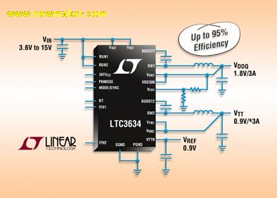 凌力爾特公司 (Linear Technology Corporation) 推出高效率、雙通道單片同步降壓型穩(wěn)壓器LTC3634,該器件為DDR1、DDR2和DDR3 SDRAM控制器提供電源和總線終端軌。LTC3634 在3.6V至15V的輸入電壓范圍內工作,從而非常適用于雙節(jié)鋰離子電池應用以及5V和12V中間總線系統(tǒng)。LTC3634采用獨特的恒定頻率/受控接通時間、電流模式架構,這種架構非常適用于從一個12V輸入電源以高開關頻率給DDR應用供電。其終端電壓VTT設定為VDDQ的1/2,可低至0.6V,準確度為±1.6%。單片設計和高達4MHz的開關頻率相結合,允許使用纖巧、低成本電容器和電感器,可為DDR電源應用提供一種非常緊湊和高效率的解決方案。