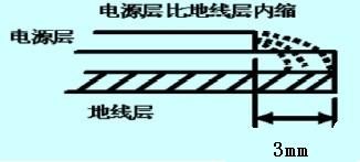 對(duì)于高速數(shù)字電路板應(yīng)該采用多層板, 以減小環(huán)路面積, 將中間層作為電源或地層, 并且盡量保證電源與地相鄰的層間距盡量小;讓每一信號(hào)層都有一對(duì)應(yīng)的地線層, 信號(hào)線與其地回路構(gòu)成的環(huán)面積要盡可能小, 環(huán)面積越小, 對(duì)外的干擾越少。針對(duì)這一特點(diǎn), 在地平面分割時(shí), 要考慮到地平面與重要信號(hào)走線的分布, 防止由于地平面開槽等帶來的問題,信號(hào)線不能跨越地平面和電源平面分隔區(qū), 防止形成大的地線回路。同時(shí)電源層應(yīng)該比地線層內(nèi)縮3 m m 左右的距離, 這樣將能夠抑制70% 以上的電源干擾。如圖2 所示。
