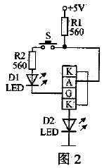 可控硅檢測電路如圖2所示,先用萬用表檢測出被測可控硅的A、G、K極,再將被測可控硅的A、G、K三個引腳插入對應的插孔中,接通電源,不按按鈕開關S時,發(fā)光二極管D2不發(fā)光,按一下按鈕開關S時,若發(fā)光二極管D2能持續(xù)發(fā)光,則被測可控硅是好的。