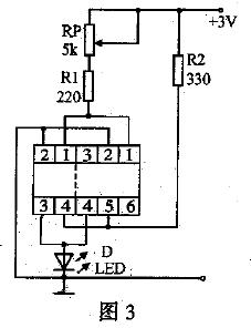 光電耦合器檢測電路如圖3所示,可將TLP621等四個引腳的光電耦合器插入插座左端的四個引腳的插孔中,將TLP332等六個引腳的光電耦合器插入插座右端的六個引腳的插孔中。接通電源后,電源經(jīng)RP、R1給IC中的發(fā)光二極管提供一個正向電壓,發(fā)光二極管發(fā)光,使IC中的光電三極管導通,3腳外接的發(fā)光二極管D發(fā)光,若調節(jié)RP時,發(fā)光二極管的亮度能跟著變化,則被測光電耦合器是好的。