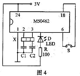陶瓷振子檢測電路如圖4所示,外接元件455kHz或500kHz陶瓷振子X,C1、c2與集成電路M50462的2、3腳內(nèi)部電路組成455kHz或500kHz的振蕩電路,將被測的455kHz或500kHz陶瓷振子插入插孔中,接通電源,按住按鈕開關S時,發(fā)光二極管能不停地閃爍發(fā)光,則說明被測陶瓷振子是好的。