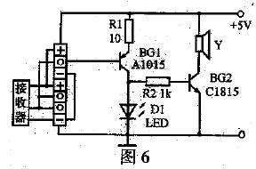 紅外線遙控接收器和紅外線遙控發(fā)射器的檢測電路如圖6所示。圖中Y是直徑為1cm,高為1cm左右的圓柱形小體積蜂鳴器,插孔的標號“+”、“-”表示遙控接收器的電源端,“o”表示遙控接收器的信號輸出端。若檢測一體化的三端紅外線遙控接收器,將被測遙控接收器的3只引腳插入對應的插孔中,接通電源,用一只好的紅外線遙控發(fā)射器對著遙控接收器,按住遙控發(fā)射器的任意按鍵時,若D1能閃爍發(fā)光,同時蜂鳴器Y發(fā)聲,則被測紅外線遙控接收器是好的。若要檢測紅外線遙控發(fā)射器的好壞,要將一只好的紅外線遙控接收器插入插座中,按下被測紅外線發(fā)射器的任何按鍵時,發(fā)光二極管D1都能閃爍發(fā)光,同時蜂鳴器發(fā)聲,則被測紅外線遙控發(fā)射器是好的。