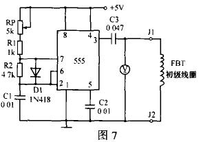行輸出變壓器檢測電路如圖7所示,555集成定時器與外接元件構成多諧振蕩器。調節(jié)RP可產(chǎn)生12.5~25kHz的方波脈沖,由3腳經(jīng)C3耦合輸出作為FBT初級線圈電諧振的激勵脈沖,C3與FBT初級線圈組成一串聯(lián)諧振電路。
