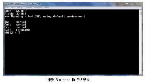patch 完成的u-boot source code 可以產生ROM版的u-boot image,直接開機后的執(zhí)行結果如圖表3所示。