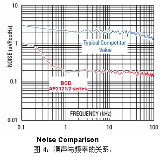 當然也有例外,個別歐美的大廠商采用先進的工藝設計生產(chǎn)的的CMOS LDO把本該外面加的Bypass電容做到了芯片里面,這樣的LDO產(chǎn)品的噪聲約為100 uVrms的水平。