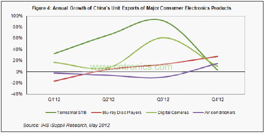 據(jù)IHS iSuppli公司的中國研究服務(wù),2012年第一季度中國主要消費(fèi)電子產(chǎn)品的出口高于預(yù)期,主要是因?yàn)殇N售渠道中的庫存較低,需要購買更多產(chǎn)品以補(bǔ)充庫存。