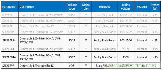 圖2 NXP中小功率市電供電可控硅調光LED驅動IC選型表格