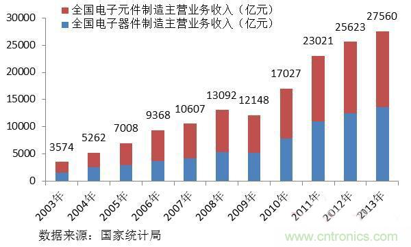 電子元器件是我國電子信息產(chǎn)業(yè)中的重要門類,產(chǎn)值比重約占電子信息產(chǎn)業(yè)的五分之一。2003-2013年,我國電子元器件行業(yè)增速迅猛,年復合增長達到了22.7%,從2003年的3574億元增長到2013年的2.76萬億元。其中,2013年電子器件制造和電子元件制造主營業(yè)務收入分別達到1.39萬億和1.36萬億元。
