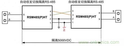 RS485的應(yīng)用中,有時需對信號進(jìn)行增強(qiáng),或不同的RS485網(wǎng)絡(luò)之間進(jìn)行電氣隔離,輸入和輸出都是RS485信號,此時需用到RS485的中繼器。而基于RSM485系列,可快速搭建簡易的隔離型RS485中繼器,如圖2 和圖3所示。