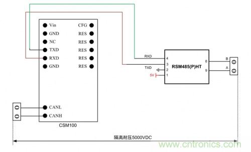RS485和CAN雖然物理層都是差分傳輸,但因CAN多了更多的底層協(xié)議,兩者不能通過簡單的方式直接轉(zhuǎn)換。此時,使用如圖6所示的CSM100+RSM485模塊方式,利用CSM100能將CAN轉(zhuǎn)成UART數(shù)據(jù),再用RSM485PHT將UART轉(zhuǎn)成RS485電平,實(shí)現(xiàn)RS485轉(zhuǎn)CAN的功能。