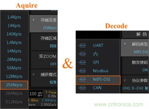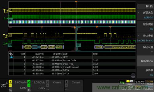(1)現(xiàn)場模擬MIPI-DSI協(xié)議,使用數(shù)據(jù)挖掘型示波器ZDS4054 Plus,其免費(fèi)標(biāo)配MIPI-DSI協(xié)議低速LP模式解碼功能,具體操作如下圖7所示。