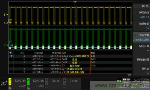 (2)ZDS4054 Plus標(biāo)配512Mpts的存儲深度,且可對全內(nèi)存數(shù)據(jù)進(jìn)行解碼,MIPI-DSI協(xié)議解碼界面如圖8所示??赏ㄟ^事件表查看具體的解碼內(nèi)容,也可以將事件表中的內(nèi)容通過導(dǎo)出報(bào)表的格式將其導(dǎo)出。