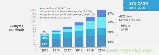 移動(dòng)網(wǎng)絡(luò)和Wi-Fi流量占有率比較。固定式/Wi-Fi流量自2018年起超越固定式/有線(wired)網(wǎng)絡(luò)流量(來源:Cisco)