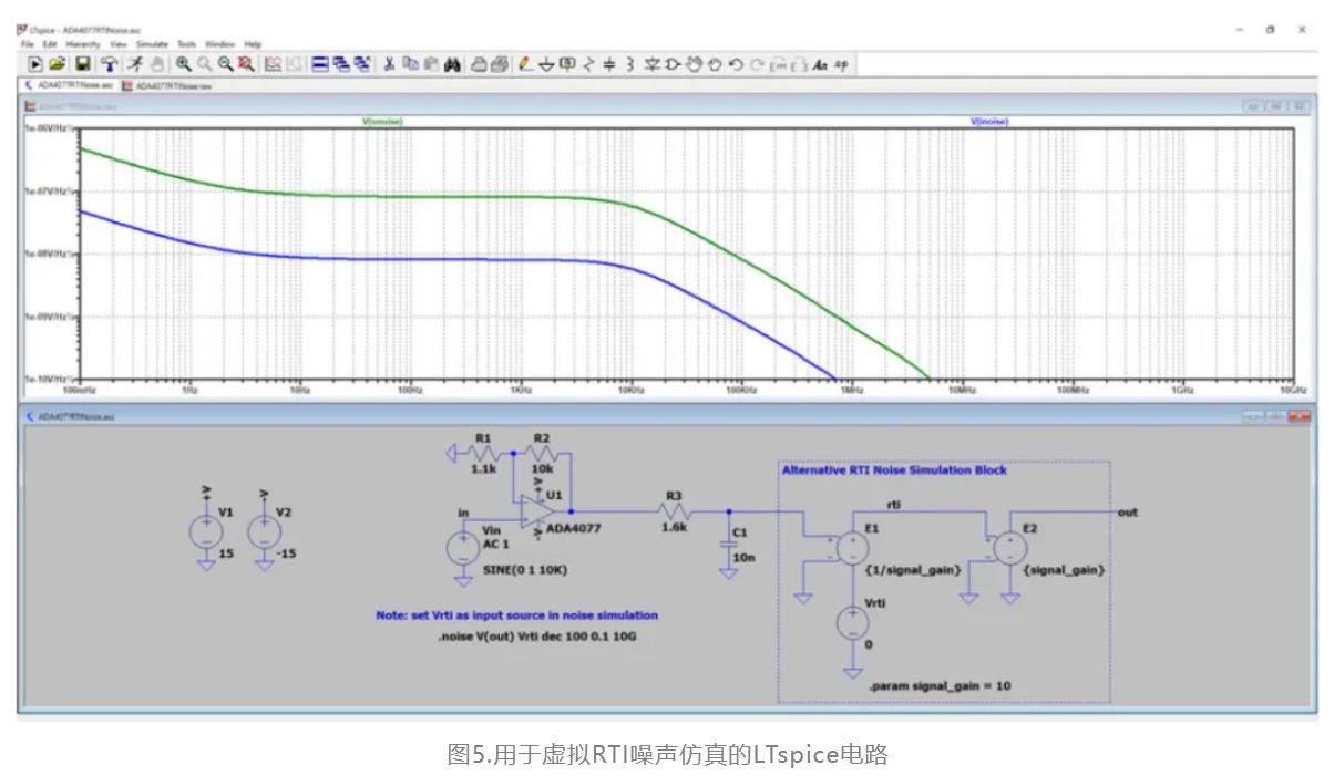 LTspice的多功能性和準(zhǔn)確性使其對噪聲仿真非常有用。輸出節(jié)點和輸入源在噪聲仿真命令中指定,輸出噪聲(RTO)是查看分析結(jié)果的默認(rèn)方式。LTspice還會根據(jù)RTI的傳統(tǒng)定義計算參考到指定輸入源的輸入噪聲,但如圖4所示,對傳統(tǒng)RTI噪聲進(jìn)行積分無法提供有意義的結(jié)果。圖5顯示了如何在LTspice的輸出中添加一級,以便仿真器返回替代的虛擬RTI噪聲。運行仿真后,在選定圖形的情況下,從Plot Settings—Add Trace將輸入噪聲添加到圖形中,然后選擇V(inoise)。這會將輸入噪聲添加到圖形中。曲線形狀與輸出噪聲相匹配,表明整個電路的頻率響應(yīng)都得到了考慮。在按住ctrl鍵的同時左鍵單擊圖形中標(biāo)題為"V(inoise)"的曲線,以對總RTI噪聲進(jìn)行積分。