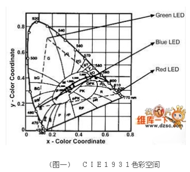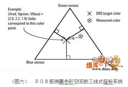基本上來(lái)說(shuō),三色光感測(cè)器會(huì)產(chǎn)生一個(gè)三維色彩規(guī)格系統(tǒng),因此稱為RGB感測(cè)器色彩空間,這個(gè)系統(tǒng)可以讓特定色彩由感測(cè)器的輸出電壓來(lái)指定,例如具備特定亮度的D65白光可以記錄為:(Vred,?。郑纾颍澹澹?,?。郑猓欤酰澹剑ǎ玻?,?。玻?, 1.9)volts。