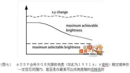 另一點(diǎn)相當(dāng)重要,同時(shí)必須注意的是,當(dāng)LED使用時(shí)間越久,光輸出強(qiáng)度就會(huì)降低,因此經(jīng)過(guò)一段時(shí)間后,RGB?。蹋牛南到y(tǒng)的最大可輸出亮度將會(huì)下降,雖然在大部分的應(yīng)用事實(shí)上都可以接受逐漸且穩(wěn)定的亮度衰減,但有時(shí)無(wú)法接受的是RGB發(fā)光系統(tǒng)色度的變化,ASSP擁有能夠穩(wěn)定控制RGB發(fā)光系統(tǒng)光度衰減的功能,例如維持色度的穩(wěn)定在一定的容忍度內(nèi),甚至當(dāng)最高可輸出亮度下降時(shí)。