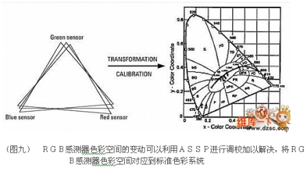 系統(tǒng)A中的三色光感測(cè)器在達(dá)成D65光輸出時(shí),會(huì)產(chǎn)生以上的電壓位準(zhǔn),但對(duì)系統(tǒng)B的光感測(cè)器,雖然達(dá)到和A系統(tǒng)一樣的D65光輸出,卻會(huì)產(chǎn)生不同的電壓位準(zhǔn)組合。換句話來(lái)說(shuō),由RGB感測(cè)器色彩空間所定義的色彩規(guī)格系統(tǒng)在每個(gè)系統(tǒng)都不一樣。