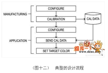 在生產(chǎn)階段,系統(tǒng)可以透過(guò)使用標(biāo)準(zhǔn)的CIE相機(jī)進(jìn)行調(diào)校,調(diào)校資料必須儲(chǔ)存在一個(gè)外部的短暫的記憶體中,而系統(tǒng)在導(dǎo)入到應(yīng)用后并不需要進(jìn)行調(diào)校程序。在應(yīng)用上,使用者首先對(duì)設(shè)備進(jìn)行組態(tài),接著將先前儲(chǔ)存的調(diào)校資料寫入調(diào)校暫存器,這是一個(gè)簡(jiǎn)單的讀出然后寫入的程序,完成后,系統(tǒng)就可以接受目標(biāo)色的輸入。