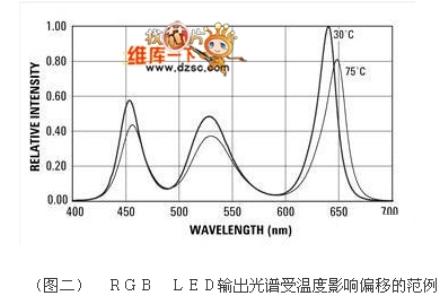 這類LED光源的簡(jiǎn)單開迴路架構(gòu)方式有個(gè)潛在的問(wèn)題,由于LED的光學(xué)特性會(huì)受到運(yùn)作條件的影響,因此組合后的RGB光源輸出的亮度以及色度都會(huì)變化。同時(shí),每顆LED元件也不盡相同,因此造成RGB光源的輸出產(chǎn)生更多變化,(圖二)與(圖三)就描述了幾個(gè)LED變動(dòng)的范例。