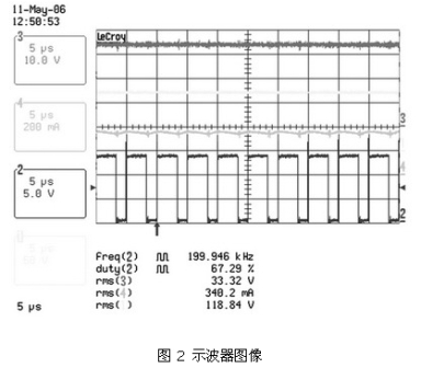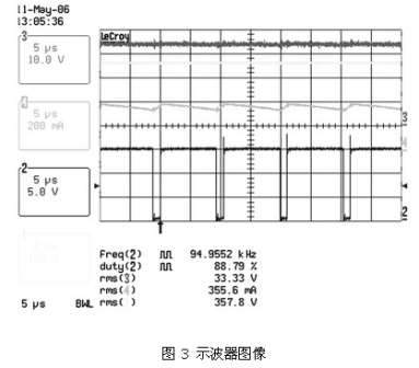 圖 2 、圖3 及表 2、表3 顯示了這種電路在90 ~265 VAC的通用輸入電壓范圍內(nèi),以350 mA驅(qū)動兩個有6個串聯(lián)LUXEON FLOOD 25-0032 HB-LED板時的結(jié)果。表 2 顯示了在輸入電壓范圍內(nèi)良好的電流調(diào)節(jié)。圖 2 和圖3 說明了正如理論所示的,由于占空比較小,輸入電壓較高時紋波較差。這表明在主電壓較低的地區(qū),如北美和日本,設(shè)備性能更加良好。然而,即使在最差的條件下,只要控制器輸入電壓保持在90 ~265 VAC的范圍內(nèi),仍可對電流進行適時調(diào)節(jié)。同時對只使用6個HB-LED板的系統(tǒng)進行了測量(見表 3) ,對比結(jié)果發(fā)現(xiàn),±1.3%的調(diào)節(jié)差距導(dǎo)致負載電壓的差距高達33.4V ~16.4V。