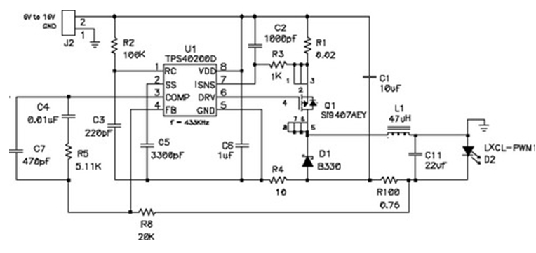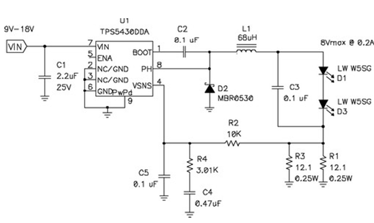 在輸出電壓始終小于輸入電壓的情況下,應(yīng)使用降壓穩(wěn)壓器,圖5顯示了該拓撲結(jié)構(gòu)。在該電路中,對電源開關(guān)的占空比 (duty factor) 進行了控制,以在輸出濾波器電感 L1 上確立平均電壓。當(dāng)FET開關(guān)閉合時(TPS5430 內(nèi)部),其將輸入電壓連接到電感器,并在L1中構(gòu)建電流。D2為環(huán)流二極管 (catch diode),可提供開關(guān)斷開時的電流路徑。電感器可對流過LED的電流起到平滑的作用,該工作可通過用電阻監(jiān)控(測量)LED電流,并將電壓與控制芯片內(nèi)部的參考電壓進行比較,最終進行調(diào)節(jié)。如果電流太低,則占空比增加,平均電壓也上升,從而也導(dǎo)致了電流的升高。該電路具有極佳的效率,因為電源開關(guān)、環(huán)流二極管以及電流感測電阻上的壓降非常低。