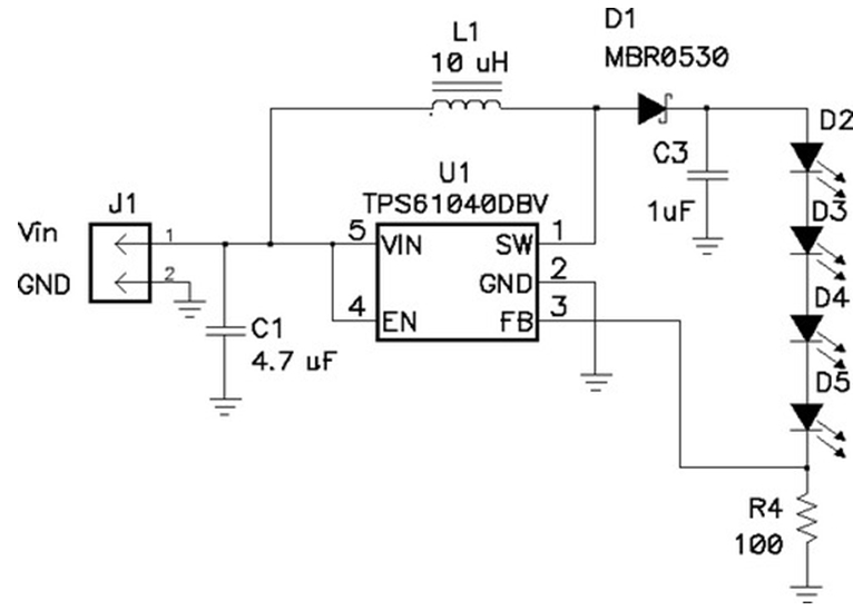 當(dāng)輸出電壓總是比輸入電壓大時,最好采用升壓轉(zhuǎn)換電路,如圖6所示。該電路的U1有一個帶有控制電子器件的高度集成的電源開關(guān)。當(dāng)開關(guān)閉合時,電流流過電感器到接地。當(dāng)開關(guān)斷開時,U1的引腳 1 電壓會升高,直到D1導(dǎo)通。然后電感器放電,電流進入輸出電容器(C3)和LED串。在絕大多數(shù)應(yīng)用中,C3通常用于平滑LED電流。如果沒有C3,則 LED電流將是斷斷續(xù)續(xù)的。也就是說,它會在零和電感電流之間切換,這會導(dǎo)致 LED 熱量增加(從而縮短使用壽命),亮度減少。在前面的例子中,LED 的電流是通過一個電阻感測的,并且占空比會發(fā)生相應(yīng)的變化。請注意,本拓撲存在一個嚴重的問題,即它沒有短路保護電路。若輸出短路,則會有較大的電流通過電感器和二極管,從而導(dǎo)致電路失效,或者輸入電壓崩潰。