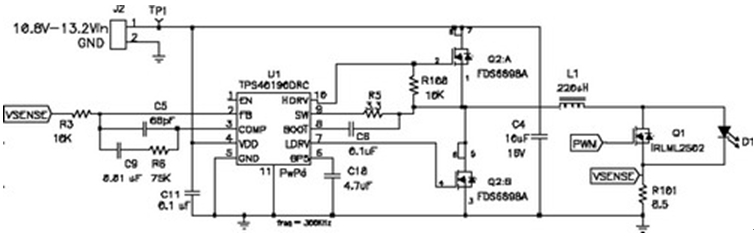 通常需要對 LED 進行調(diào)光。例如,需要調(diào)節(jié)顯示器或建筑照明的亮度。實現(xiàn)上述目標(biāo)有兩種方法:降低 LED 的電流,或快速對 LED 進行開關(guān)操作。更有效率的方法是降低電流,因為光輸出并不完全與電流呈線性關(guān)系,并且,LED 的色譜在電流小于額定值時會發(fā)生變化。人們對亮度的感知是指數(shù)型的,因此,調(diào)光可能需要對電流進行很大更改,這會對電路設(shè)計造成很大的影響??紤]到電路的容差,滿電流值工作時,3%的調(diào)節(jié)誤差可以造成10%負載時的30%或更高的誤差。通過電流波形的脈寬調(diào)制 (PWM) 進行調(diào)光更為準確,盡管這種方法存在響應(yīng)速度問題。在照明和顯示器應(yīng)用上,PWM頻率高于 100Hz,以使肉眼感覺不到閃爍。10% 的脈沖寬度在ms量級內(nèi),并要求電源的帶寬大于 10kHz,此項工作可以通過圖8(A 與 C)中簡單的環(huán)路完成。圖9為帶 PWM 調(diào)光功能的降壓功率級電路。在本例中,LED 輕松地閉合/斷開電路。通過這種方式,控制環(huán)路總是處于激活狀態(tài),并實現(xiàn)了極快的瞬態(tài)響應(yīng)。