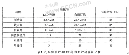(2)非常節(jié)能,比同等亮度的白熾燈節(jié)能至少在一半以上。表1列示了汽車信號燈與白熾燈能耗的比較。